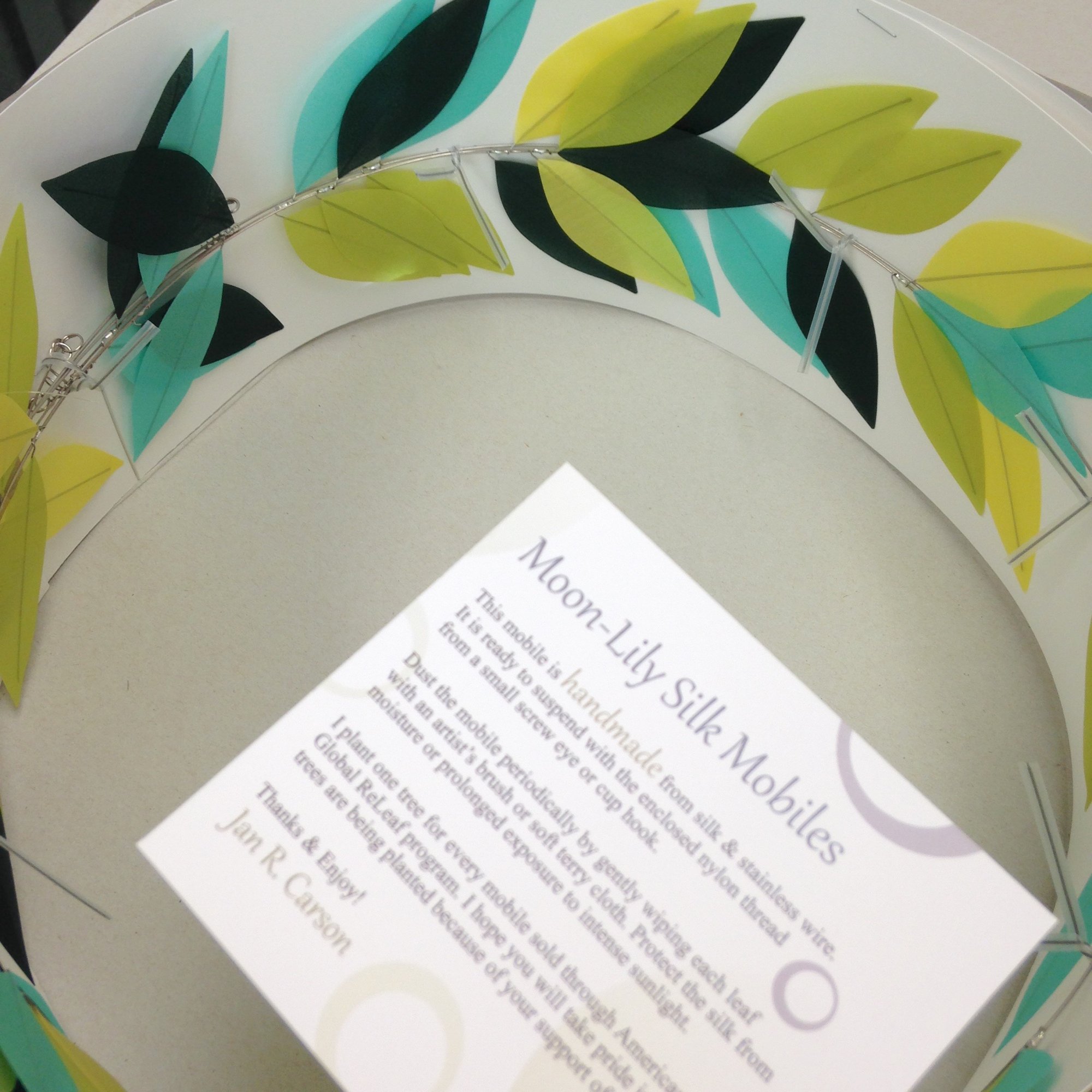 Just like any decorative object, your mobile should be dusted occasionally. It's easiest to take the mobile down, lay it flat on a table, and gently brush the upper side of the leaves with an artist’s brush or soft terry cloth. Take care not to crease the leaves, and wipe in the same direction as the leaf wire.